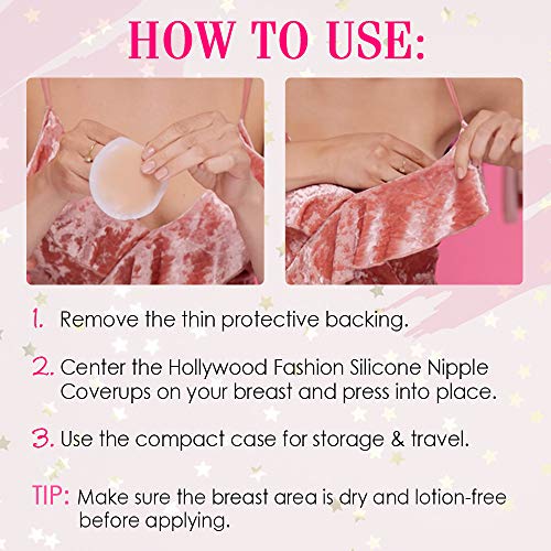 Hollywood Fashion Secrets Silicone Coverups are thin, round, and slightly padded discs that cover the nipples and provide a smooth and flawless look under clothes. They are made of medical-grade silicone that is safe for the skin and does not cause any allergic reactions. The coverups are self-adhesive and can be worn with or without a bra. They are available in two sizes: Size 1 for A/B cup and Size 2 for C/D cup.